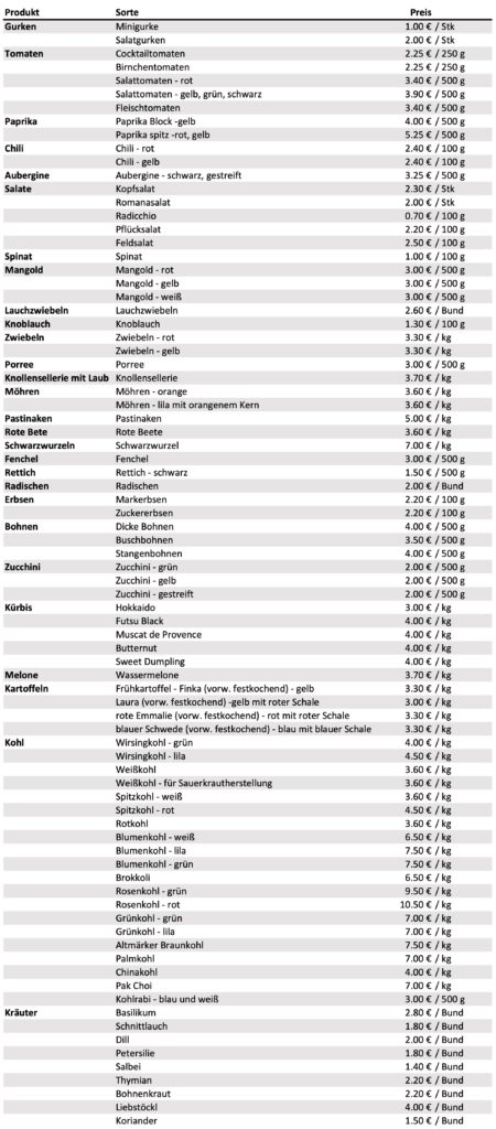 Unsere Produkte können immer Dienstag und Samstag nach vorheriger Absprache ab Hof erworben werden. Freitags liefern wir unser Gemüse für die Solawi, die Bioläden und das Bistro im Erdbär aus. An diesem Tag habt ihr die Möglichkeit euch eure eigene individuelle Bestellung je nach Angebot mit nach Cottbus liefern zu lassen.